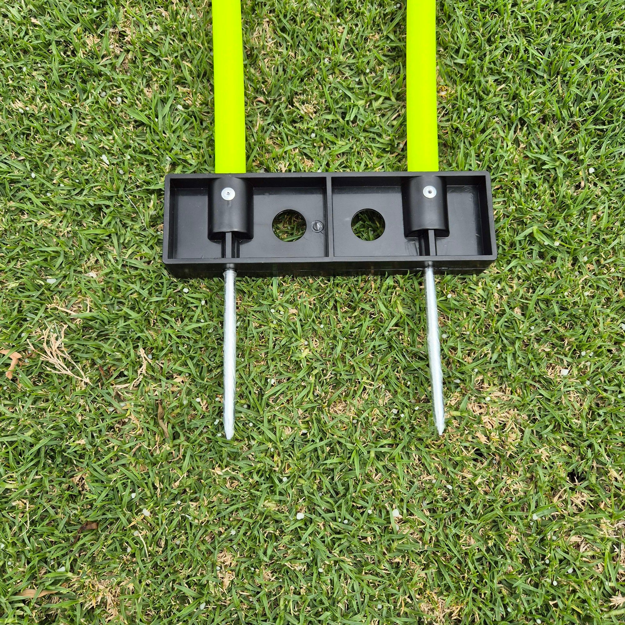 Two metal ground spikes for secure grass insertion